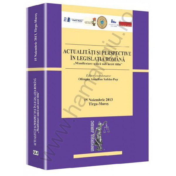 Volumul „Actualitati si perspective in legislatia romana”, aparut sub egida editurii Universul Juridic, reuneste articolele prezentate in cadrul conferintei cu aceeasi tema, care a avut loc in data de 15 noiembrie 2013 la Tirgu-Mures. Dintre temele abordate amintim „Justitia si regionalizarea”, „Medierea – actualitate si perspectiva in legislatia romaneasca”, „Aspecte generale privitoare la raspunderea penala a functionarului public”, „Diferentele dintre infractiunea de luare de mita si trafic de influenta in forma pasiva”, „Aspecte privitoare la infractiunea de primire de foloase necuvenite”, „Confiscari speciale in cazul infractiunilor de coruptie” si altele.