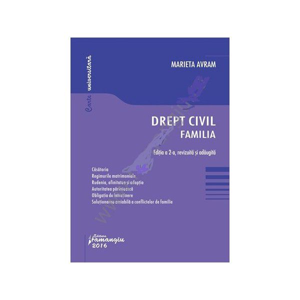 Marieta AvramLucrarea examineaza in detaliu dispozitiile noului Cod civil cuprinse in Cartea a II-a „Despre familie”, materia fiind organizata dupa structura codului intrat in vigoare la 1 octombrie 2011 si actualizata cu toate modificarile la zi intervenite in domeniu.