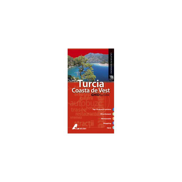 Acest ghid - complet, structurat in capitole clare, usor de consultat - va ofera toate informatiile de care aveti nevoie pentru o excursie in Turcia de Vest. Va prezinta detalii despre obiectivele de interes, enumerate in ordine alfabetica, despre istoria, cultura si gastronomia regiunii, despre magazine, restaurante, cafenele, atractii pentru copii si diverse locuri de distractie. Veti gasi aici harti si indexul strazilor, un top al atractiilor turistice si variante de plimbari si trasee auto. Informatiile practice si cele culturale sunt imbinate intr-o formula grafica atractiva.Ghidul contine top 10 Turcia de Vest - atractii turistice.